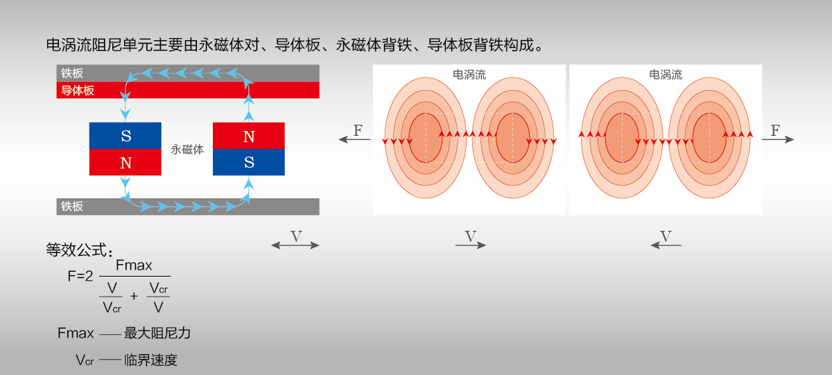 基本原理:當(dāng)導(dǎo)體板(銅板或鋁板)在兩塊永磁體之間的空氣間隙中沿垂直磁感應(yīng)強(qiáng)度方向運(yùn)動時,導(dǎo)體板中產(chǎn)生電渦流。渦流場與磁場相互作用,產(chǎn)生的洛倫茲力將阻礙導(dǎo)體板和磁場之間的相對運(yùn)動(楞次定理),同時電渦流因?qū)w板中的電阻作用而轉(zhuǎn)化為熱能耗散掉,產(chǎn)生阻尼效應(yīng)。當(dāng)導(dǎo)體板或永磁體與振動結(jié)構(gòu)連接時,導(dǎo)體板上不斷地有電渦流產(chǎn)生,同時結(jié)構(gòu)的動能不斷地轉(zhuǎn)化為導(dǎo)體板中的熱能,使結(jié)構(gòu)振動逐漸衰減。